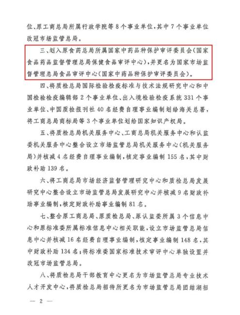 劃入原食藥總局所屬國家中藥品種保護審評委員會(國家食品藥品監督管理總局保健食品審評中心),并更名為國家市場監督管理總局食品審評中心(國家中藥品種保護審評委員會)。
